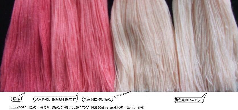 ●注意:汽蒸后需充分水洗,建議在第一次沖洗液中加入15%的浸軋液;KD-5A以及燒堿、保險粉的用量視底色深淺和需要剝除染料的多少而定。